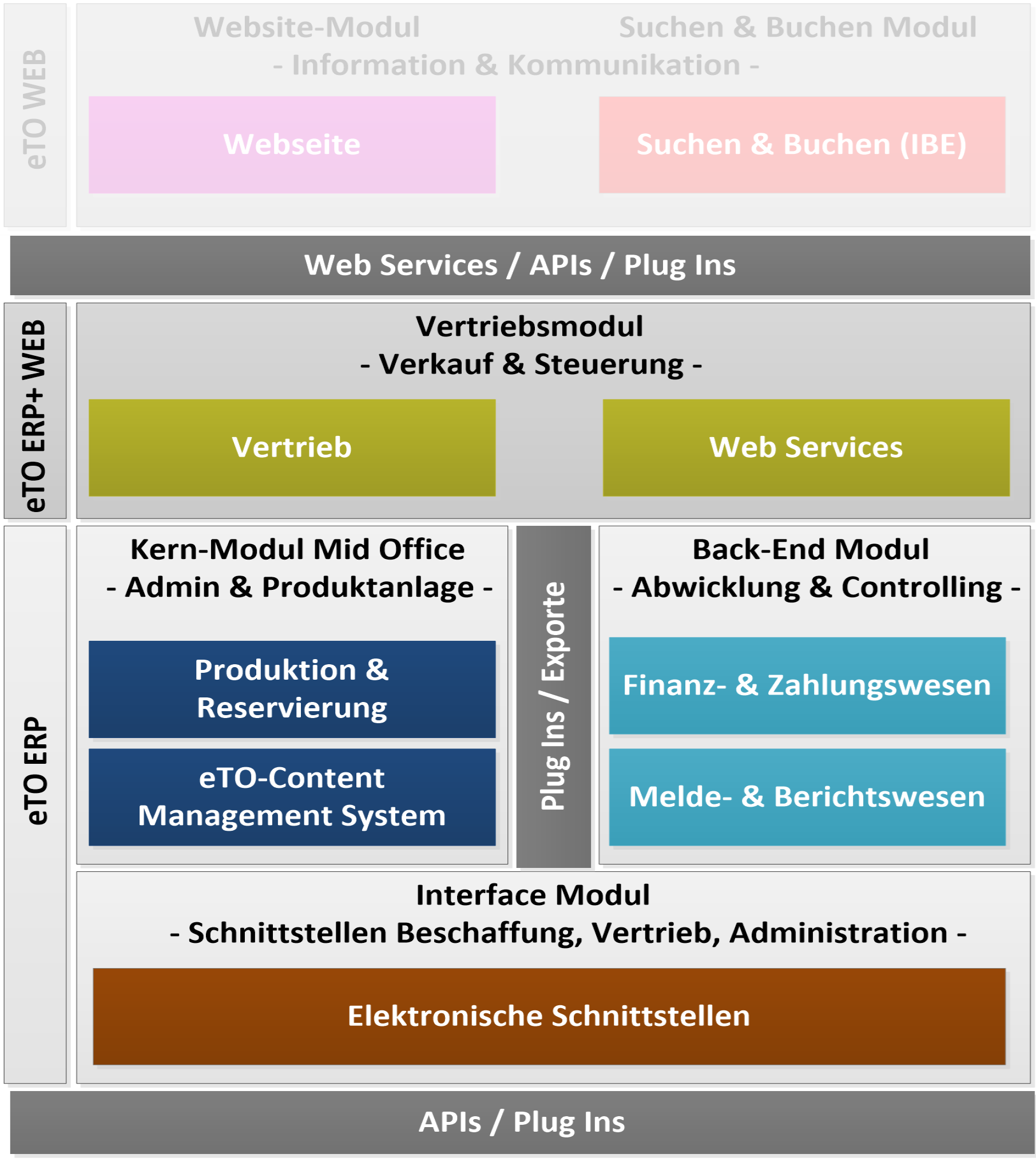 Die flexibel einsetzbare Touristik Software-Plattfom eTO ERP bildet die Prozesskette von Reiseveranstaltern und Reiseportalen ab, und dies vom Einkauf bis zum Vertrieb. Konzipiert im Baukastenprinzip verfügt es über eine moderne, robuste und leistungsfähige Architektur. eTO ERP besteht aus zahlreichen, sogenannten „Software-Modulen“, die teils webbasiert jegliche Anforderungen der modernen Veranstaltertouristik sowie des Touristikvertriebs abdecken. Nutzen Sie eTO ERP zur Produktion und Buchung von Campingurlauben und Ferienwohnungen, Yachtcharterreisen, Spezialreisen, Pauschalreisen, Flugreisen, Schiffsreisen, Busreisen, Gruppenreisen, Individualreisen und jede weitere Art touristischer Leistung. Dabei verfügt eTO ERP bereits im Rahmen seiner Basismodule über weitreichende Möglichkeiten, Ihre Angebotspalette abzubilden.